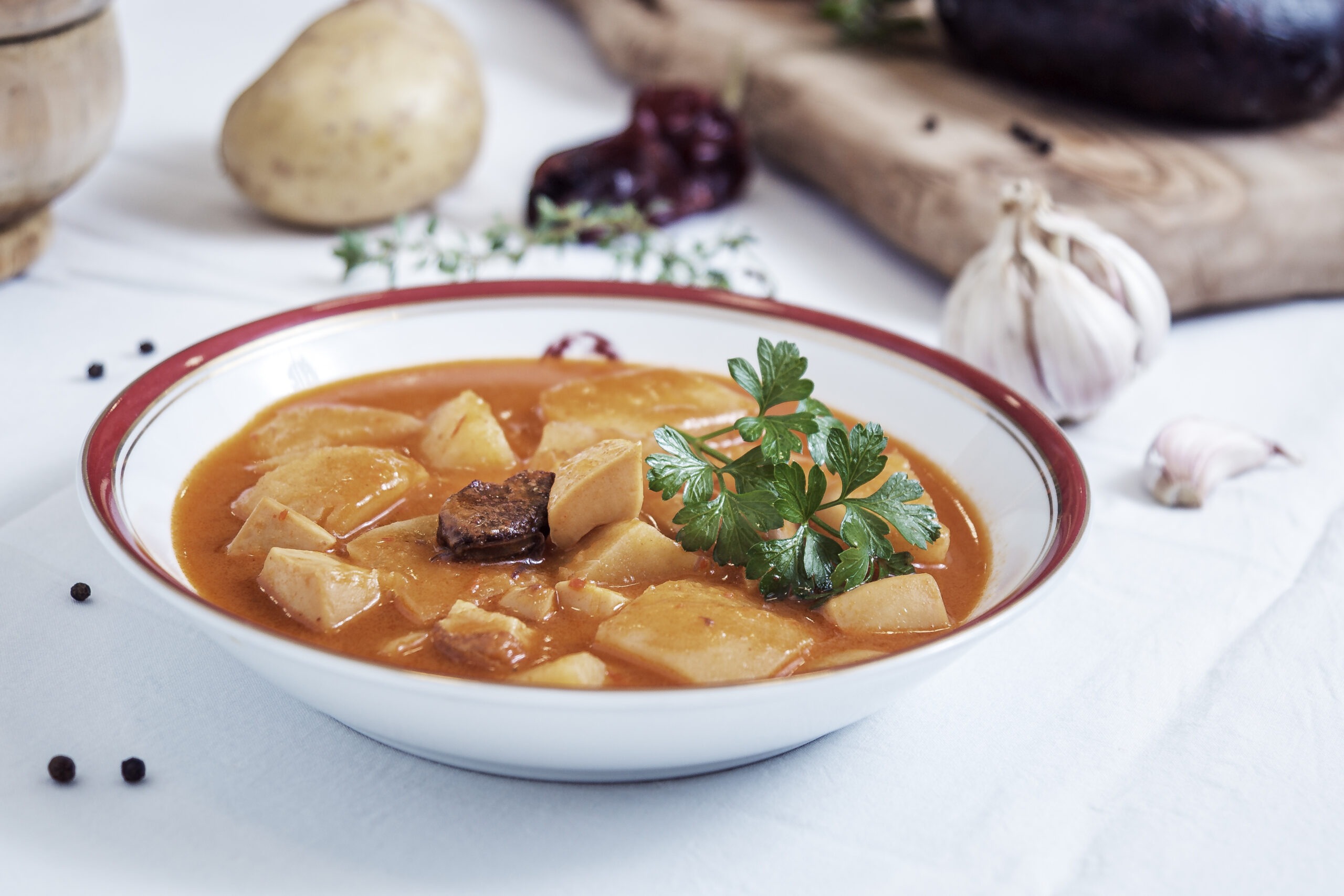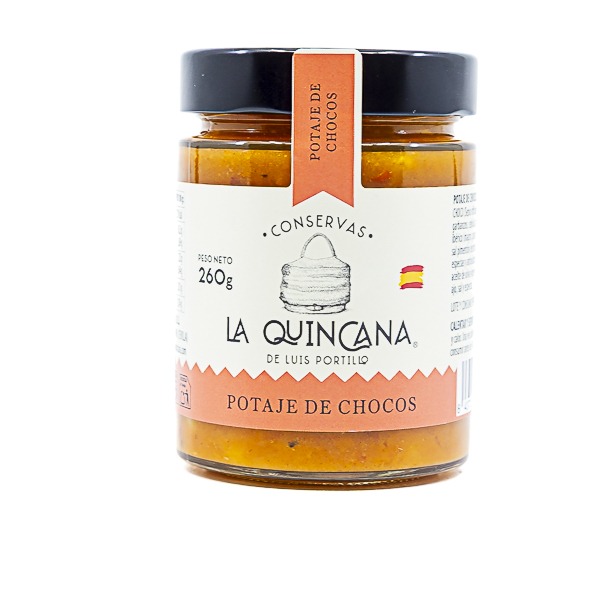 INGREDIENTES: Agua, CHOCO (Sepia officinalis) (MOLUSCO) (19%), garbanzos, cebolla, zanahoria, morcilla y chorizo ibérico (magro, grasa y sangre de cerdo ibérico, sal pimentón dextrina, dextrosa, azúcar, ajo, especias y antioxidante E-301), panceta ibérica, aceite de oliva virgen extra, almidón de maíz, ajo, sal y especias.